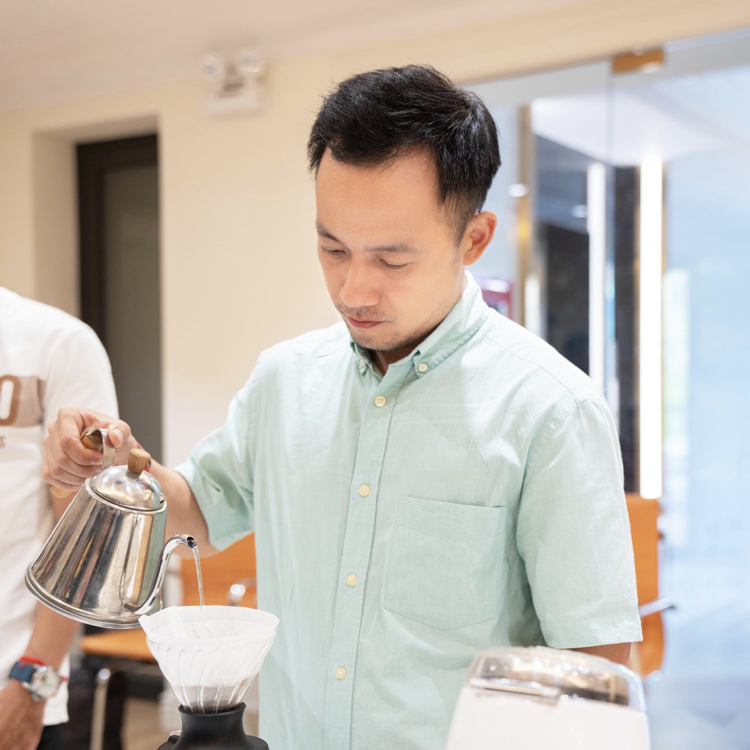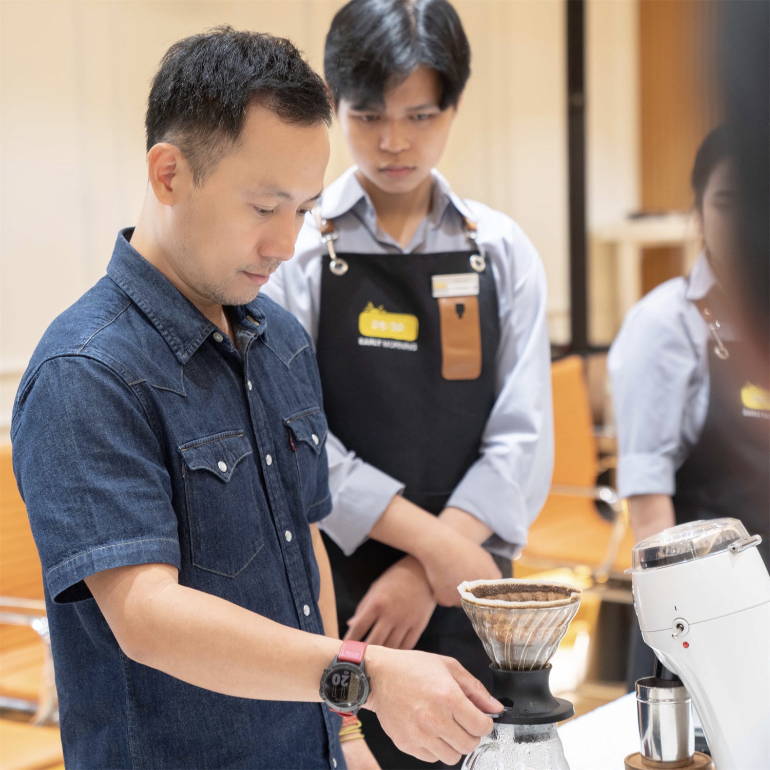 Founder Đinh Tiến Đạt thực hiện phương pháp Pour Over cùng với barista chuyên nghiệp dày dặn kinh nghiệm của Early Morning.