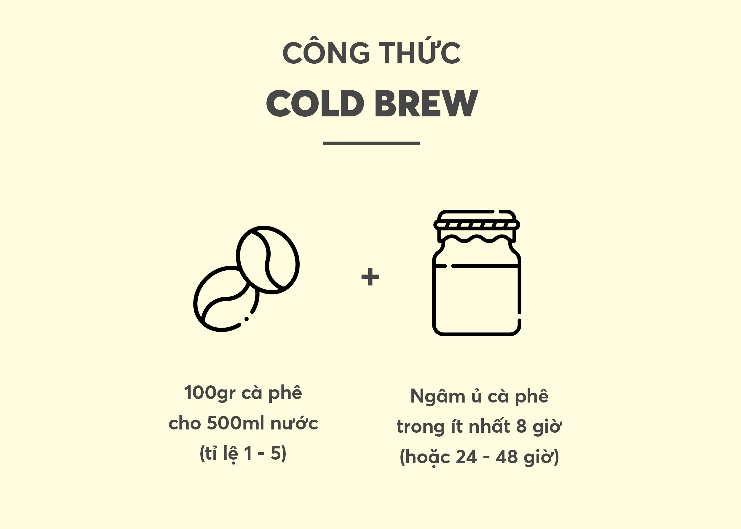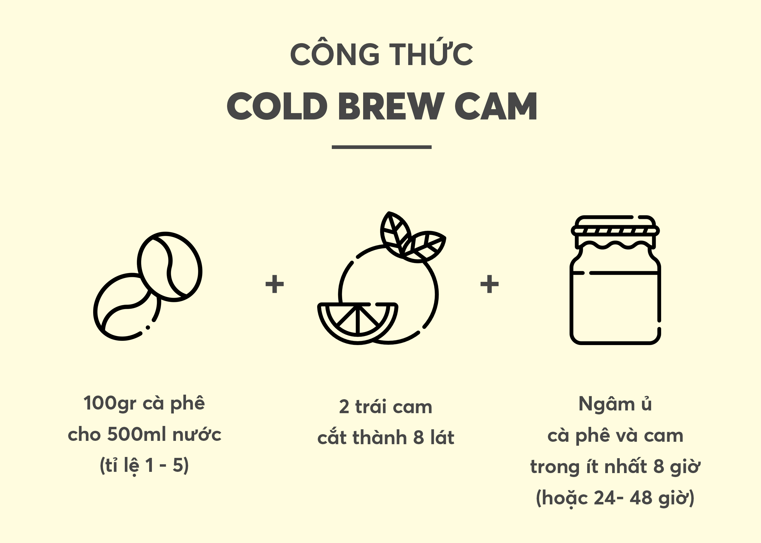 Pha chế Cold Brew Cam: Các bước thực hiện giống như pha chế Cold Brew. Điểm khác biệt bắt đầu ở bước 3, ta cho thêm những lát cam đã cắt vào trong bình chứa, ngâm ủ chung với cà phê.